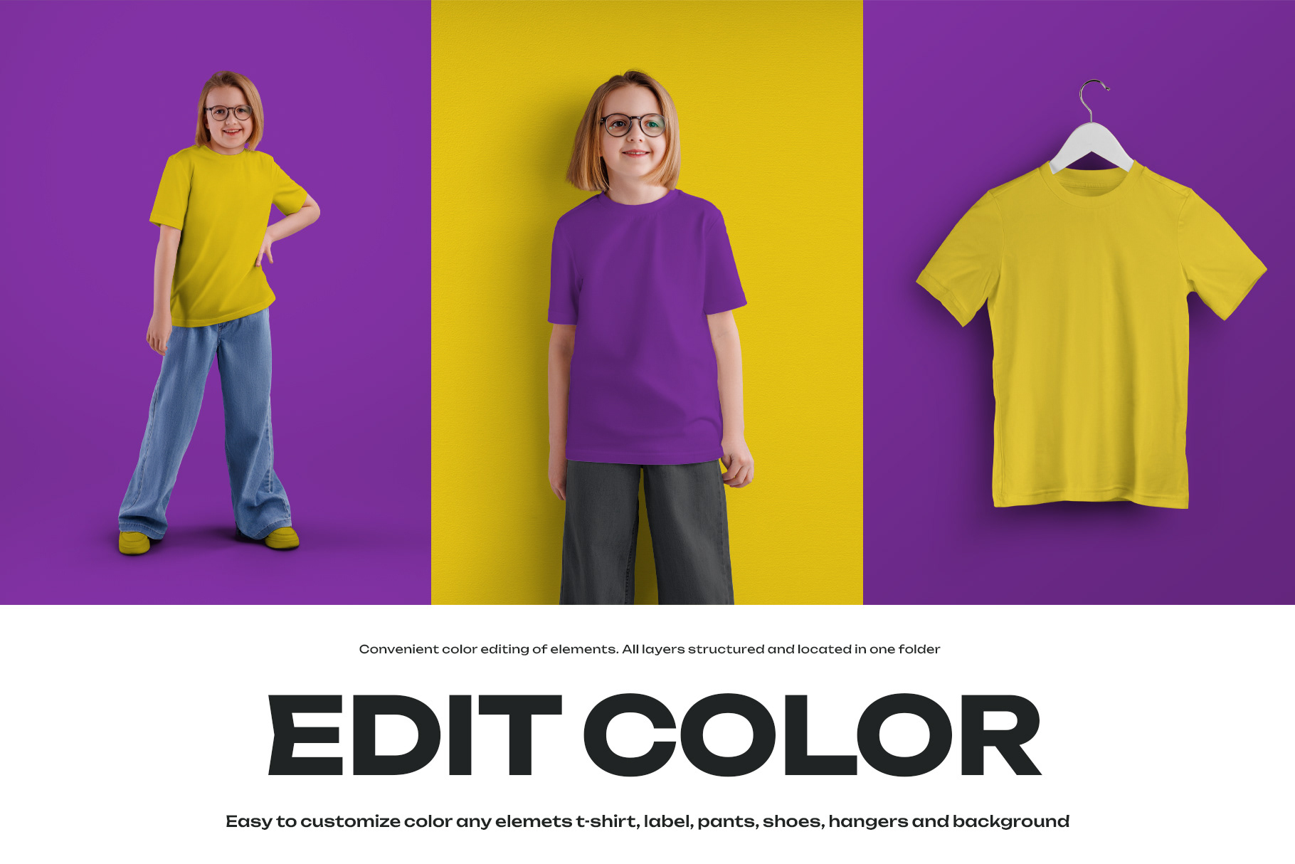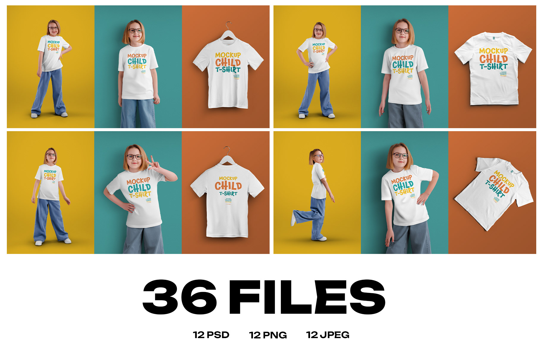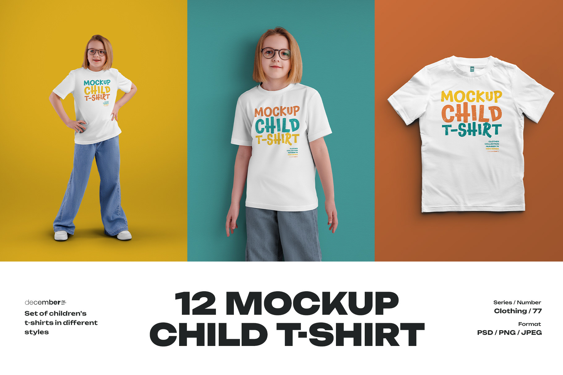 12 Mockups of a Children's T-shirt in Different Styles Easy in customizing colors all elenents T-Shirt / Hangers / Label / Pants / Shoes and Background All layers are organized, renamed and marked for a better ergonomics of the files and an easy to use. You can easily change the pattern on the T-Shirt to any other. This is mockup number 077 from the “Clothes” collections Follow us, and soon (or already have a portfolio) will be new mockups series "Books", "Print", "Packing", "Clothing", "Special" and others... Properties and Options Resolution of files 7500x3500 px; 300 dpi; RGB Compatible Adobe Photoshop CC+ 4 PSD files ( 3 mockups in each file) ; 12 PNG files; 12 JPEG files; Any color T-Shirt elements (optional); Any color Shoes (optional); Any color Pants (optional); Heater Textute (optional); Smart objects for design; 2 Options Label (optional); Any Your Background (optional); All layers organized, named and marked